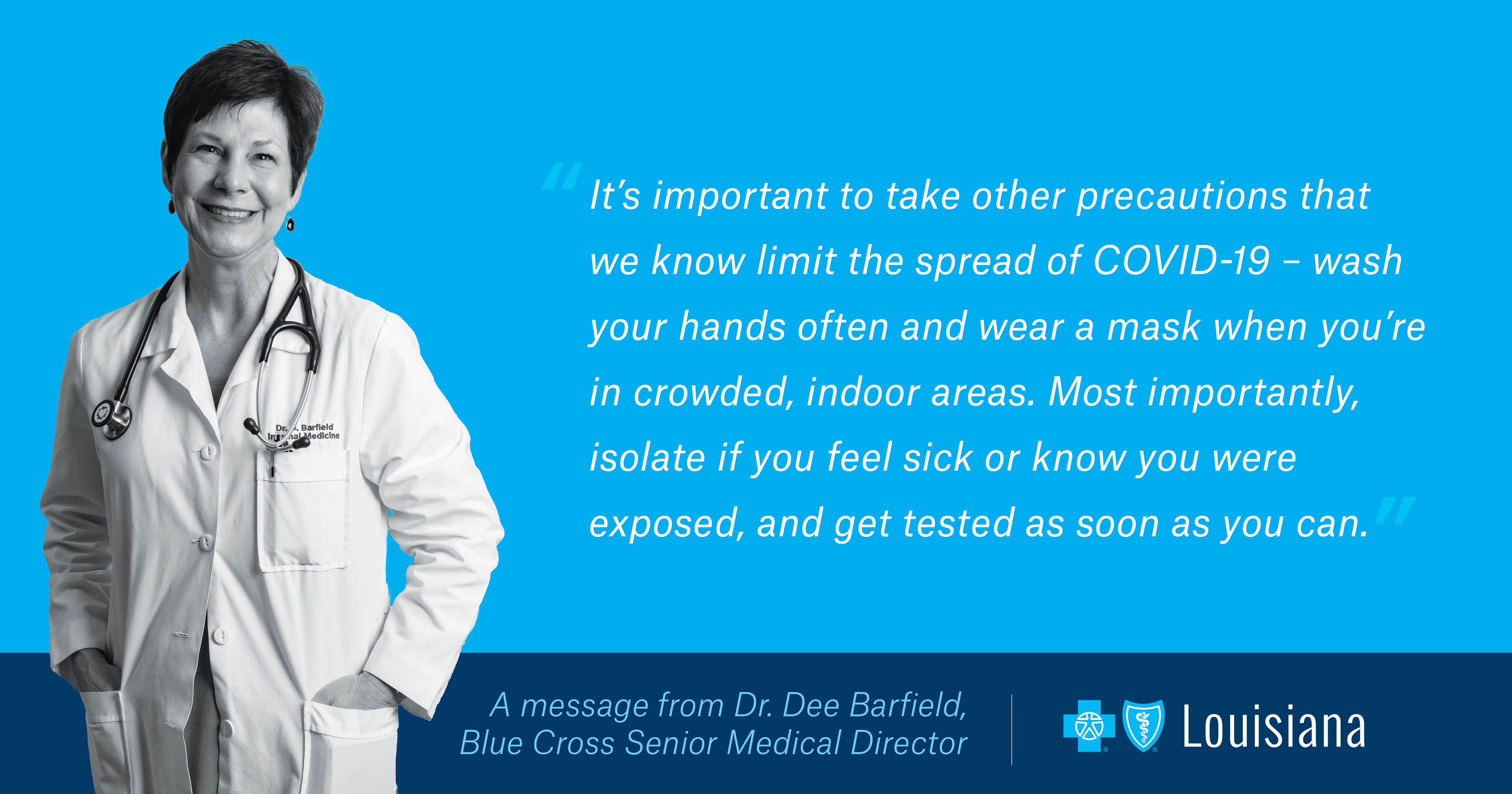 “It’s also important to take other precautions that we know limit the spread of COVID-19 – wash your hands often and wear a mask when you’re in crowded, indoor areas. Most importantly, isolate if you feel sick or know you were exposed, and get tested as soon as you can,”said Dr. Dee Barfield, Blue Cross senior medical director and vice president, Medical Management.